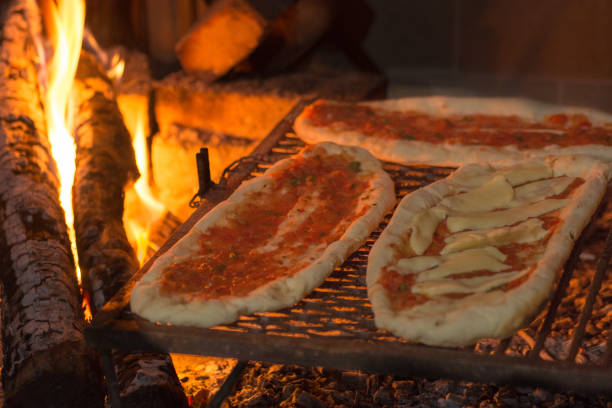 Cook over the open fire, rotating occasionally, until the crust is golden and the cheese is bubbly.