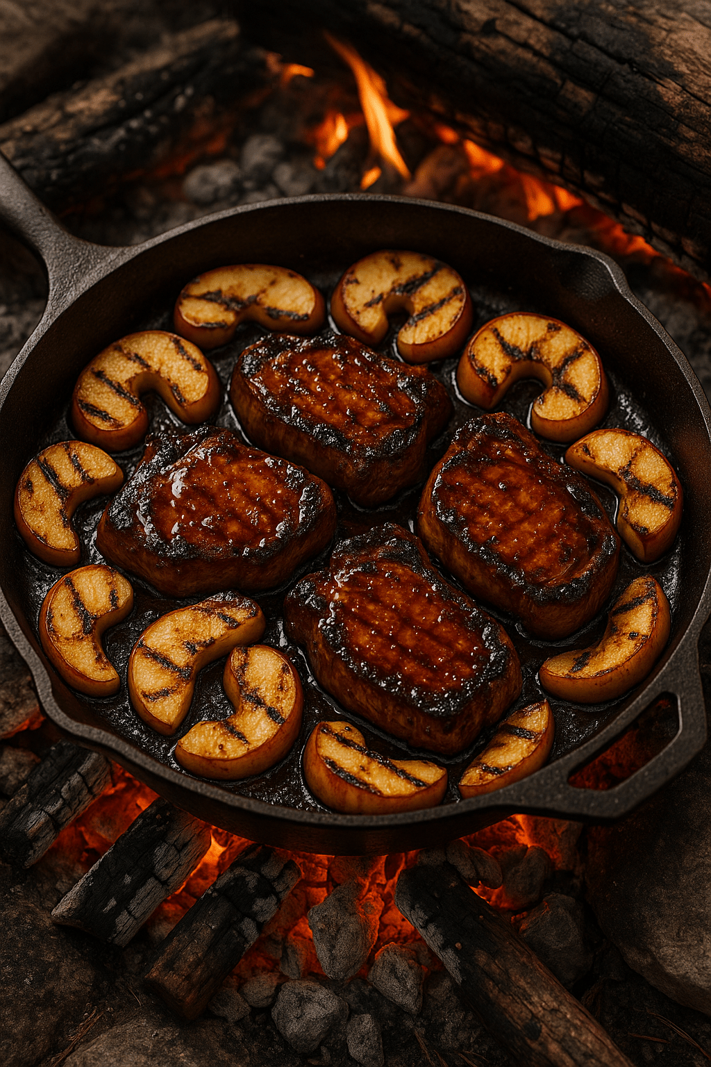 When autumn settles over Indiana, and the air takes on that crisp edge that pairs perfectly with flannel and firelight, there’s one dinner that captures the essence of the season—Maple-Glazed Campfire Pork Chops with Grilled Apples.