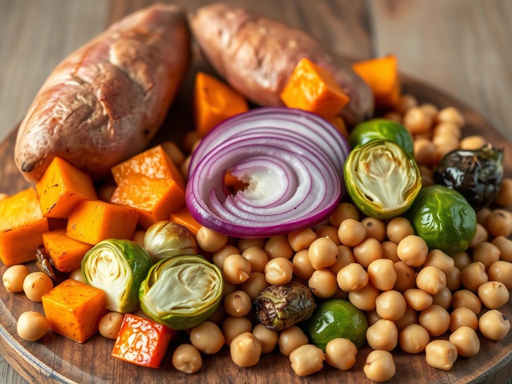 The Roast: 2 large sweet potatoes (cubed), 1 red onion (thick wedges), 1 lb Brussels sprouts (halved), 1 can chickpeas (drained and patted dry).